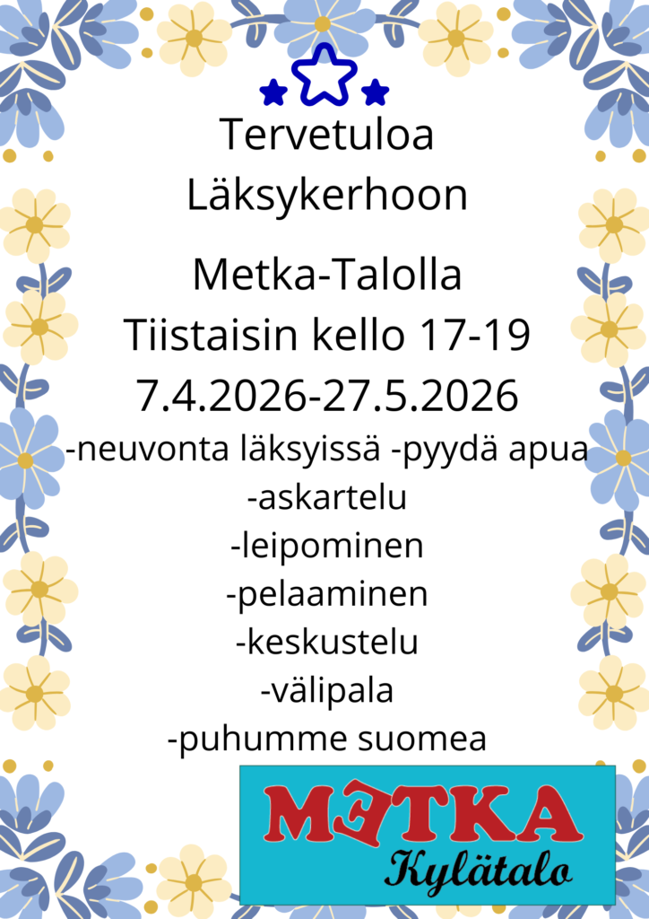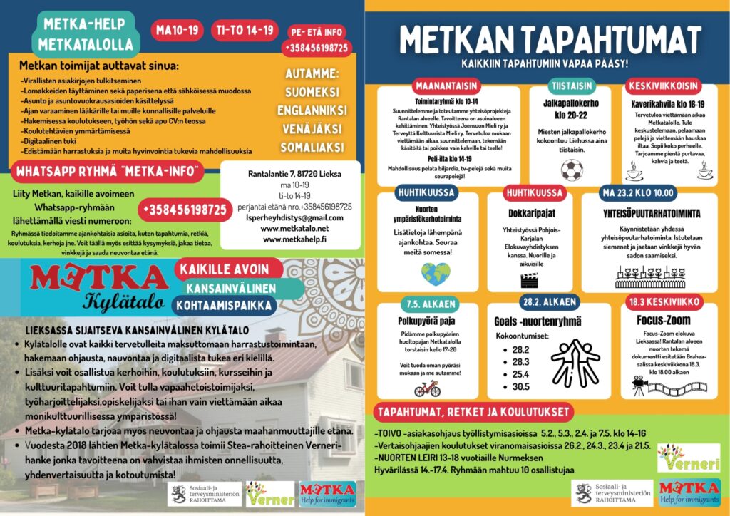 Metka kylätalo on Lieksassa sijaitseva kansainvälinen kylätalo. Kylätalolle kaikki ovat tervetulleita maksuttoman harrastustoimintaan, hakemaan ohjausta, neuvontaa, ja digitaalista tukea eri kielellä. Lisäksi voit osallistua kerhoihin, koulutuksiin, kursseihin ja kulttuuritapahtumiin. Voi tulla vapaaehtoistoimijaksi, työharjoittelijaksi, opiskelijaksi, ja ihan vain viettämään monikulttuurisessa ympäristössä aikaa. Metka-kylätalo myös tarjoaa neuvontaa ja ohjausta maahan muuttaneille etänä.